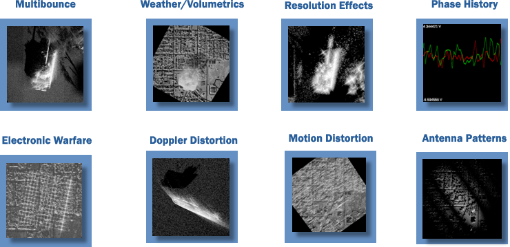 - Hundreds of parameters: platform position, aim point, antenna configuration, resolution, entities/targets, kinematics, etc.